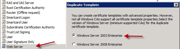 2. Right click on Web Server, duplicate the template, and then select either template type, but I choose Windows Server 2003 Enterprise. The 2008 template gives you more options, and is required if you want to use Suite-B encryption algorithms like elliptical curve. However, the Windows Server 2008 certificate template will NOT work with VMware View 5.1 connection server, so use 2003 instead.