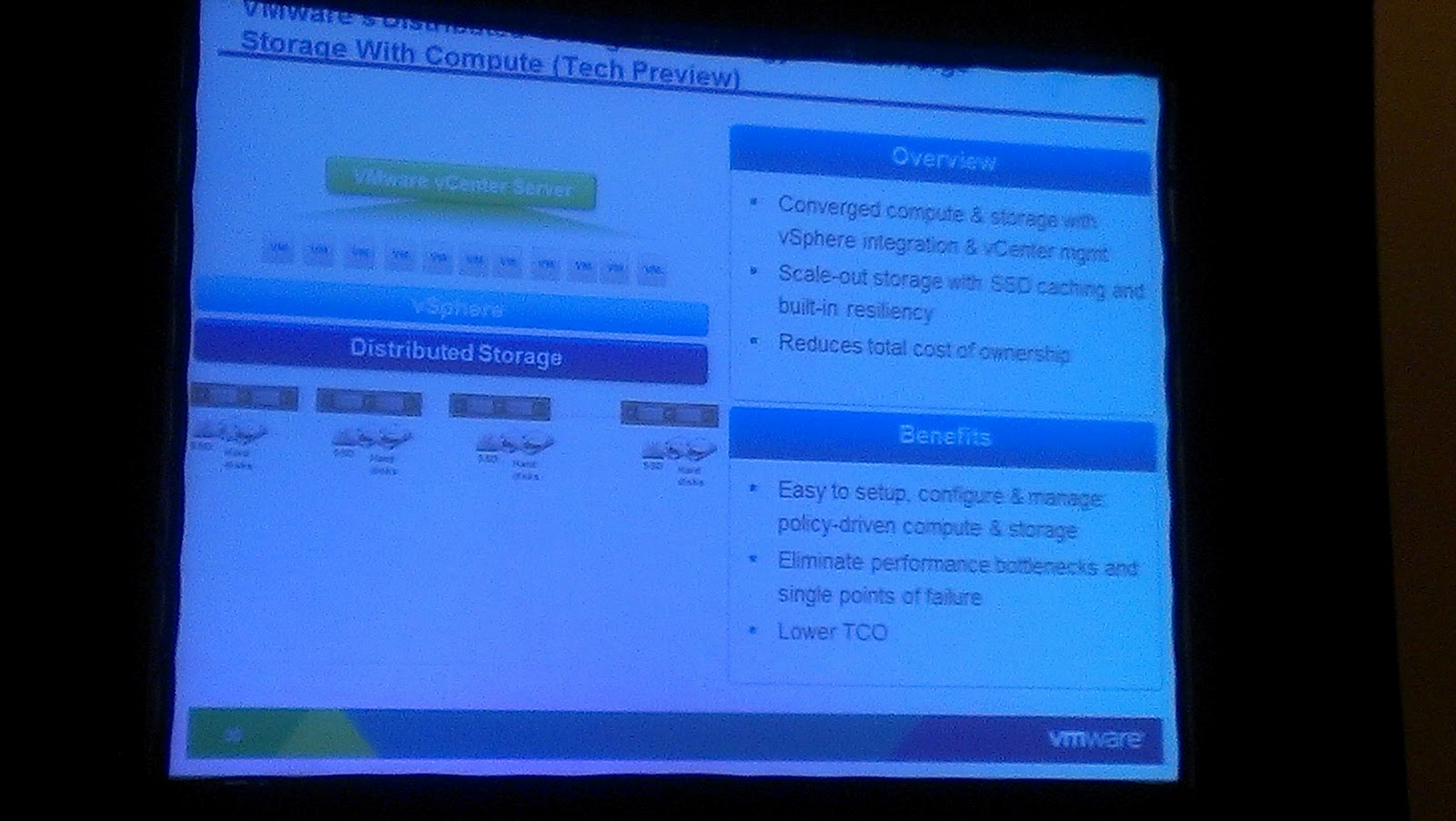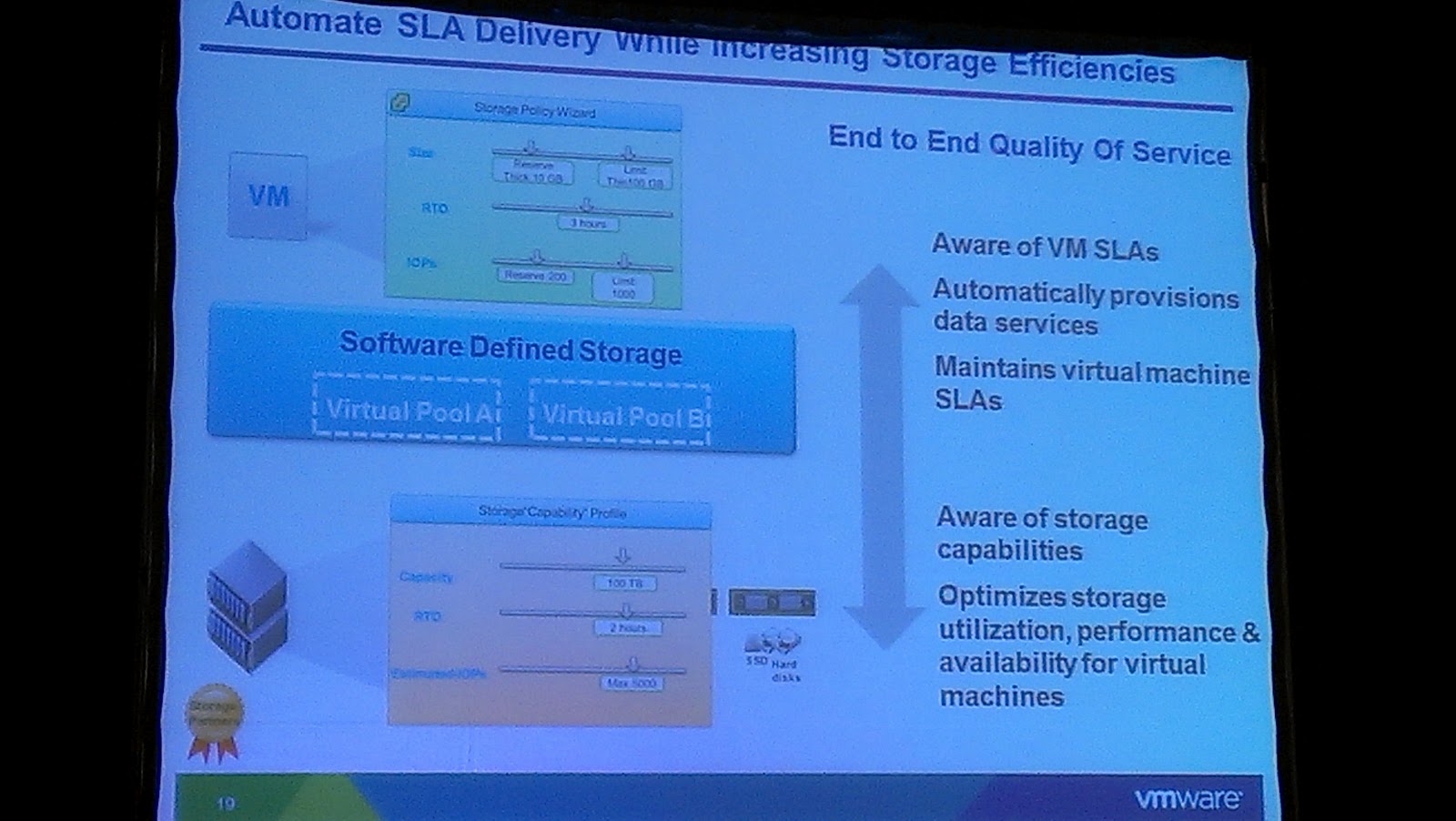 This session was an overview of where VMware sees the direction of storage for virtualized datacenters. To keep with the theme of ‘software defined’ everything, they also have a vision for software defined storage. It is a radical departure from how we view storage today, and the concepts of LUNs and datastores will go away. A session later today will do live demos of some of these features, so stay tuned for another blogpost on this subject. Session notes: