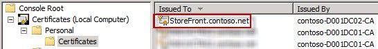The first thing you need to do is look in the server’s computer certificate personal store for your IIS certificate. In my case I’m looking for the StoreFront.contoso.net certificate. Since I knew I’d be exporting the whole certificate (including the private key), I made sure when I was requesting the certificate to allow the private key to be exported. You can request certificates from your MS CA a variety of ways, so I’ll assume you can find the option to allow private key export.