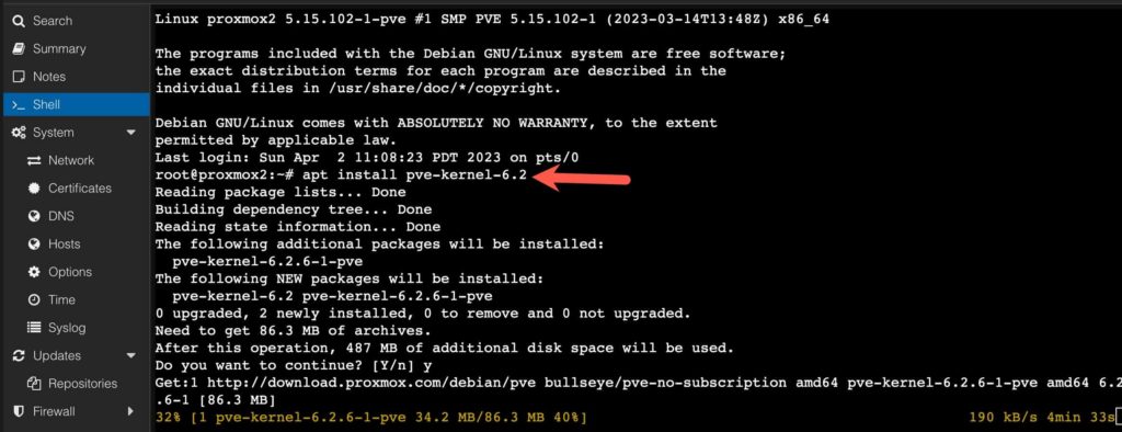 1. Log back into Proxmox, go to the Shell and run the following commands. Press Y to complete the installation.