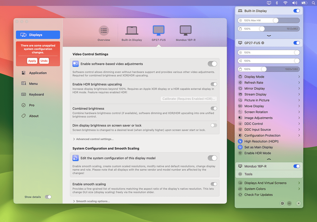 (Free/$18 Pro one-time) BetterDisplay is an awesome monitor management utility that I recently discovered. It allows you to configure virtually every aspect of your monitor including custom resolutions, HiDPI, software adjustment of brightness/contrast, monitor input switching, and a lot more. The UI has an astonishing amount of customization, including keyboard shortcuts.Â