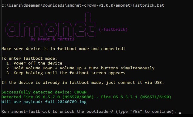6. If you have the right Echo Show and firmware the batch file will detect it and ask you to confirm the jailbreak process. Enter YES.