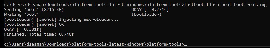 11. Unzip the boot-root file and copy the boot-root image file into the unzipped Android SDK directory. Run the following command: