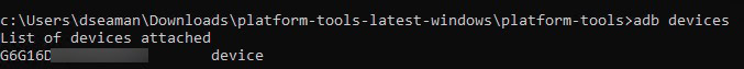 14. Back on your Windows machine run the following command and verify that the serial number of your Echo Show is listed. This means your Echo Show is in debug mode and we can side load packages (among other things).