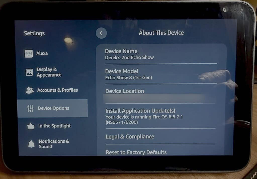 After the update skip through any additional configurations screens, such as photos and sidewalk. Once you reach the home screen, swipe down and go into Settings, then tap on Device Options. In the right pane scroll down “About this device” and if there’s another update, install it. Go through the update process.