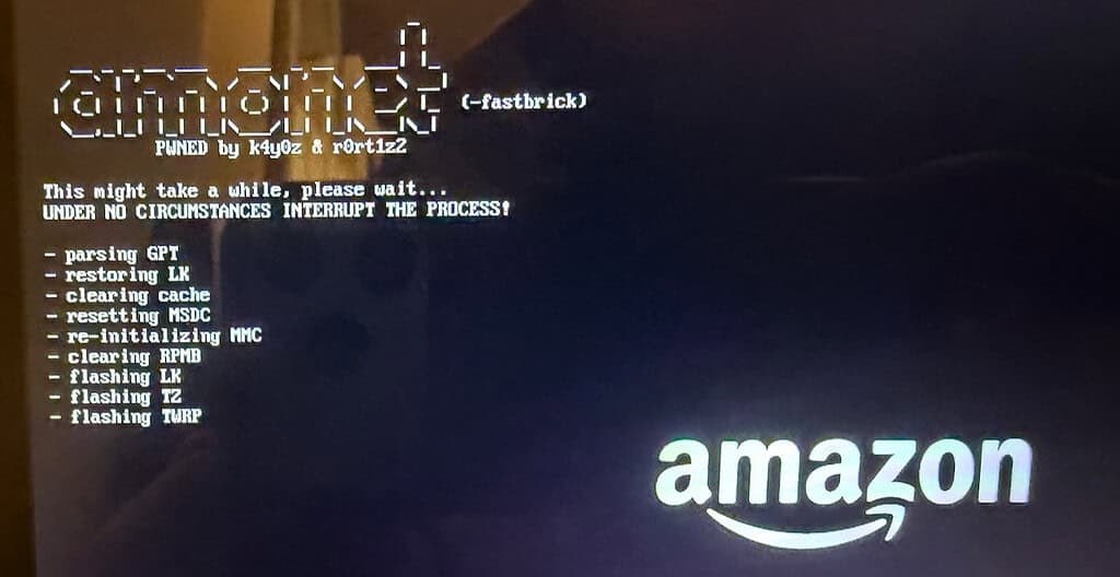 7. If the jailbreak is successful, you will see an amonet screen appear on your Echo show and see the flashing process. After the flashing process is finished, the Echo Show will reboot into the new custom boot loader, TWRP.