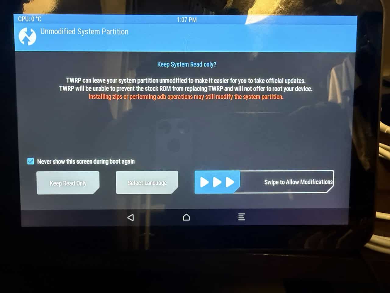4. Go to your Echo Show and it should be on the TWRP screen. Tap on the “Never show the screen…” and swipe in the indicated area.