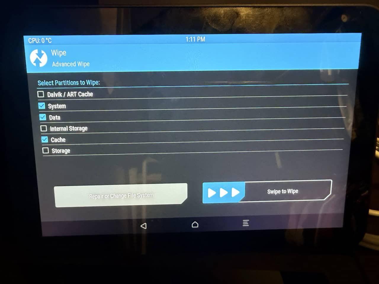 5. On the next screen tap on Wipe, then Advanced Wipe. Tap on ONLY system, data, cache. Swipe in the indicated area to wipe the selected partitions.