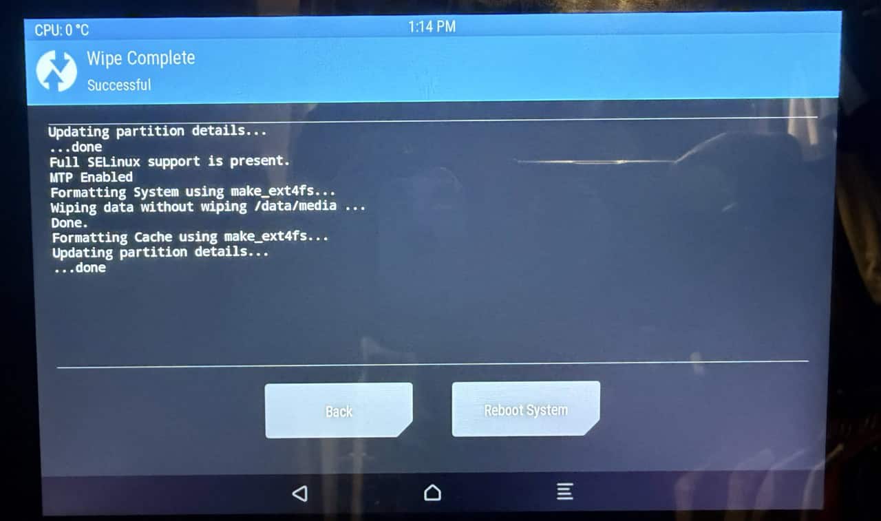 6. After the partitions are wiped, tap Back. Tap again in the upper blue area to return to the main TWRP home screen.