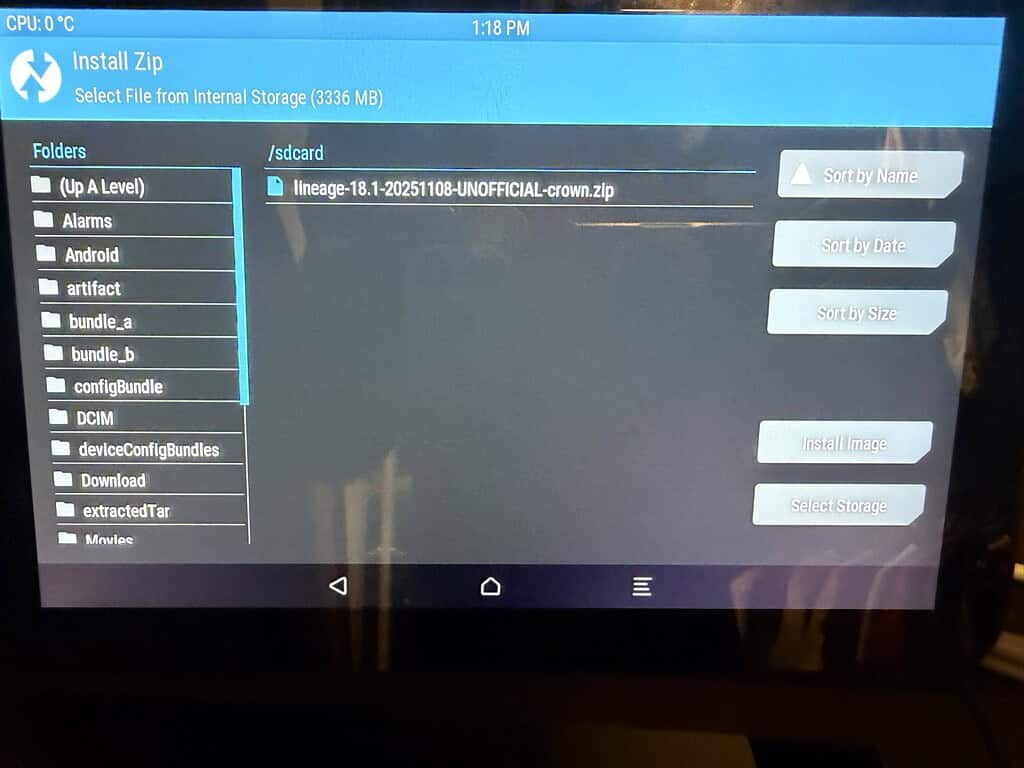8. Under /sdcard you should see the lineage ZIP file that you uploaded. Tap on the zip and tap Install Image. On the confirmation screen tap the reboot option then swipe to flash.