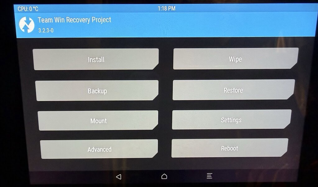 2. Boot your Echo Show into TWRP (pull power, hold volume UP, apply power). Wait for TWRP to boot up.
