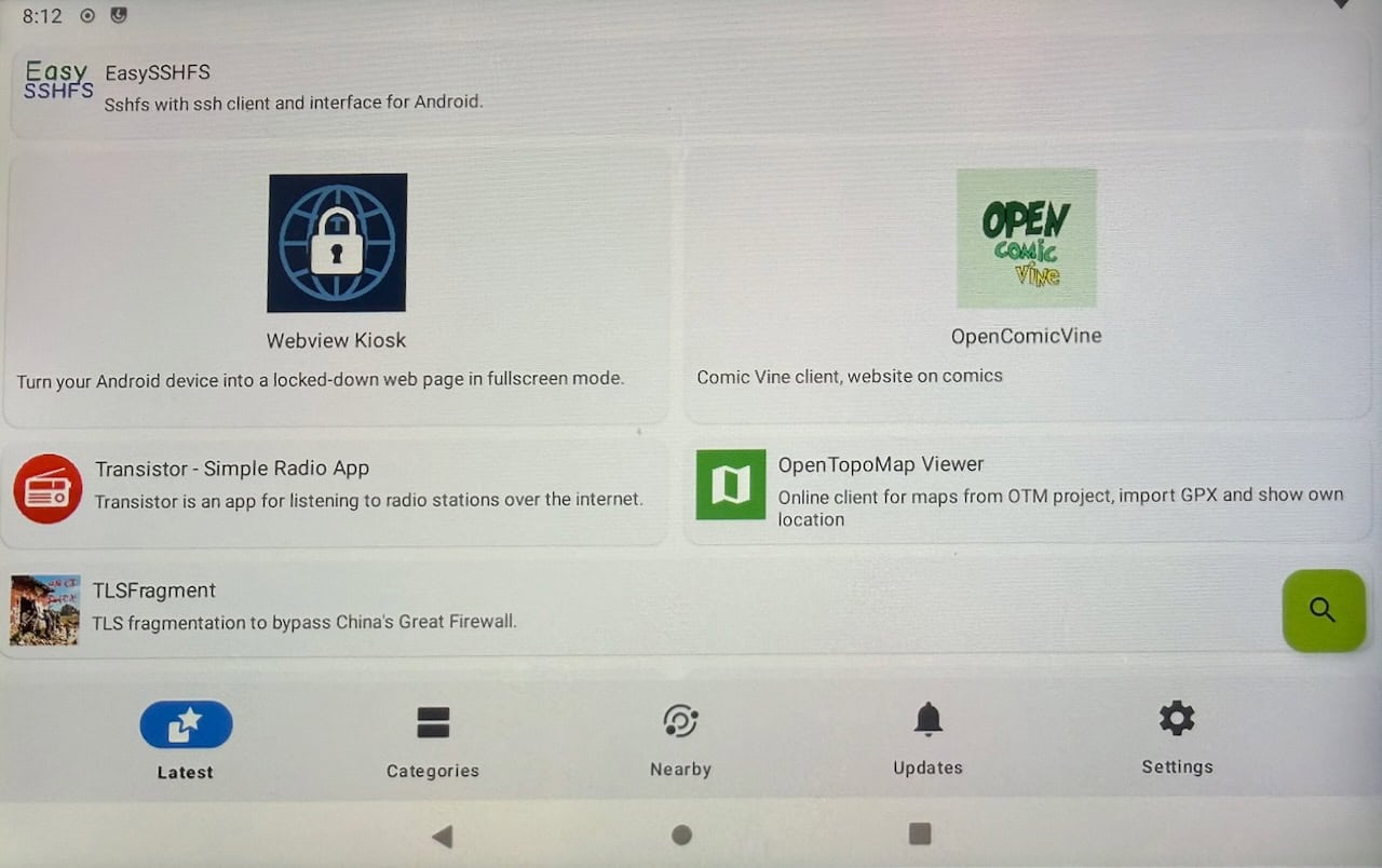 4. We will need to wait for F-Droid to (slowly) download the whole repo catalog of apps. I left my Echo show for 5 minutes and when I came back it was populated. You can tell the catalog was downloaded by the populated F-Droid homepage.