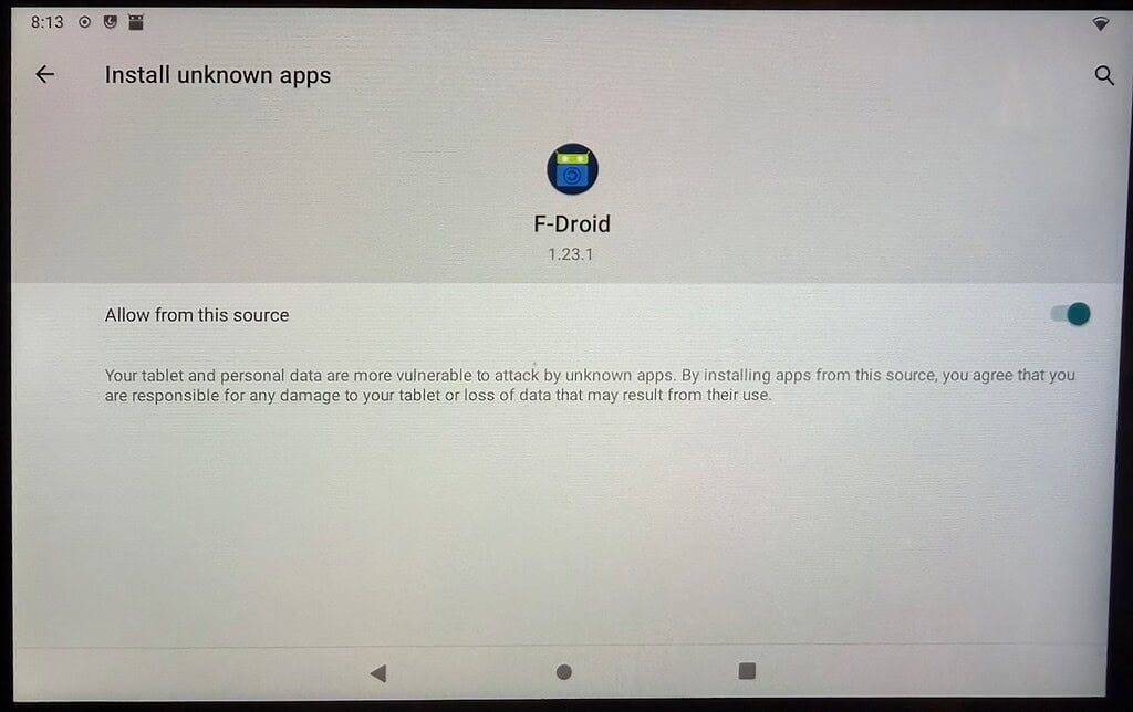 7. Tap on the green search icon and search for Home Assistant. Tap Install. You will get a security pop up. Tap on Settings and enable the F-Droid app source. Run through the rest of the installation process.