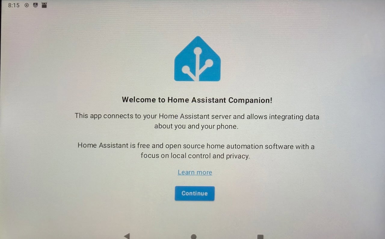 6. Go back to the Android app home screen and launch Home Assistant. Walk through the on boarding and login process. I suggest setting up a dedicated Kiosk user in Home Assistant and NOT using your primary admin account.