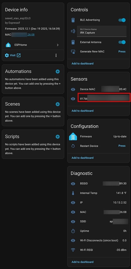 Over on my Github page, I forked an ESPHome package which can grab IRKs from your iPhone, Android phone, and smart watches. It is called “IRK Capture” and uses the ESP-IDF framework, giving it broad ESP32 device compatibility. Simply flash this package to your favorite ESP32 device, then pair your device to the ESP32 and it should instantly grab your IRK. My Github repo has all of the instructions.Â