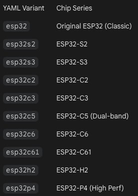 13. The esp32_variant variable must match the same chipset type as your ‘board’. Refer to the table below for the valid variant values (as of January 2026).Â