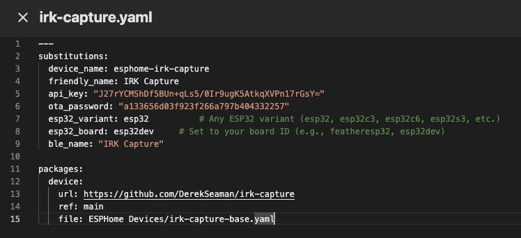 Option 1 (Recommended): This option and pulls the configuration YAML and IRK Capture components live from Github when you compile the code. This requires no mucking with the Home Assistant filesystem, and is the quickest deployment method. In addition, whenever I update the Github repo, rebuilding the firmware will always grab the latest version. All you need is about 15 lines of YAML which I provide in a template form.