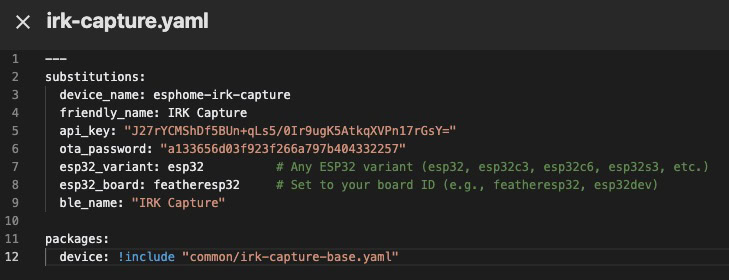17. On my Github repo download the irk-capture-base.yaml file to your PC. Using the tool of your choice (such as Studio Code Server), locate the esphome/common directory in the Home Assistant filesystem. Create the ‘common‘ directory if it doesn’t already exist. Copy the irk-capture-base.yaml file to the common directory.