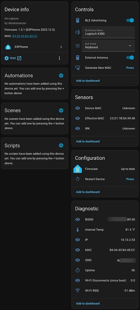My IRK Capture package has been successfully tested with Apple iPhones, iPads and watches with the ’26 OS family. I also used a Samsung Galaxy S25+ and Galaxy Watch8 Classic. It also uses the ESP-IDF framework, which should enable this package to run on any ESP32 that has Bluetooth and is supported by ESPHome.