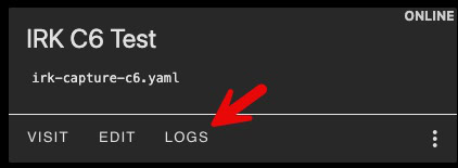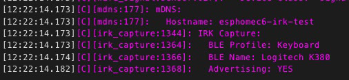 If you run into issues capturing your IRK, you can review the IRK Capture logs for more information. To see the live logs open ESPHome Builder in Home Assistant. Find your IRK Capture device and click on Logs. I prefer connecting wirelessly. Towards the bottom of the logs you should see some details about the IRK Capture configuration.