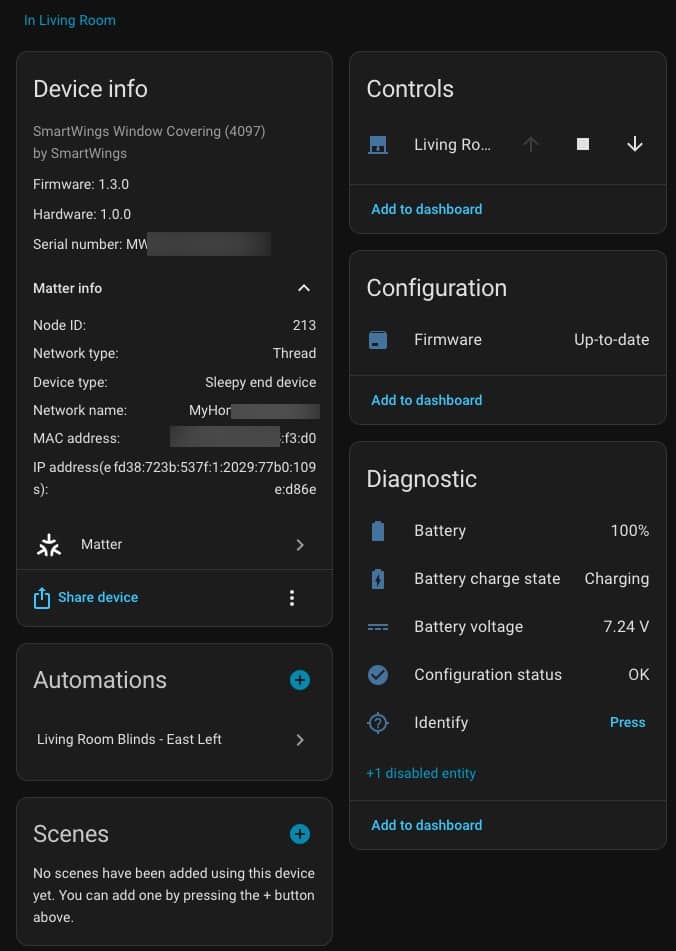 During the installation process I paired the SmartWings blinds to Home Assistant via Matter over Thread. In Home Assistant you have basic up/down controls, plus a number of diagnostic sensors. I’m glad to report the battery and charging status seems accurate, and reports in real time. Should future firmware updates be needed, these blinds support OTA updates.Â